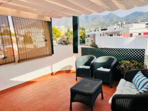 Dicho ático dúplex consta de dos dormitorios muy luminosos abuhardillados, cocina abierta amueblada y equipada, un baño completo, salón comedor con acceso a la terraza, una terraza cubierta con pérgola, vistas al Casco Antiguo y a la famosa Sierra Blanca (Juanar y La Concha). Además al ser dúplex en la parta alta de la vivienda tiene una solario privado donde podrá instalar un chill-out y disfrutar de las vistas panorámicas 360º al mar, ciudad y montaña. Todos los servicios a pie de calle para hacerte la vida más fácil y cómoda como farmacia, supermercados, restaurantes, Hospital Ochoa, etc…,, por lo que, no necesitarás vehículo para desplazarte (todo un lujo).