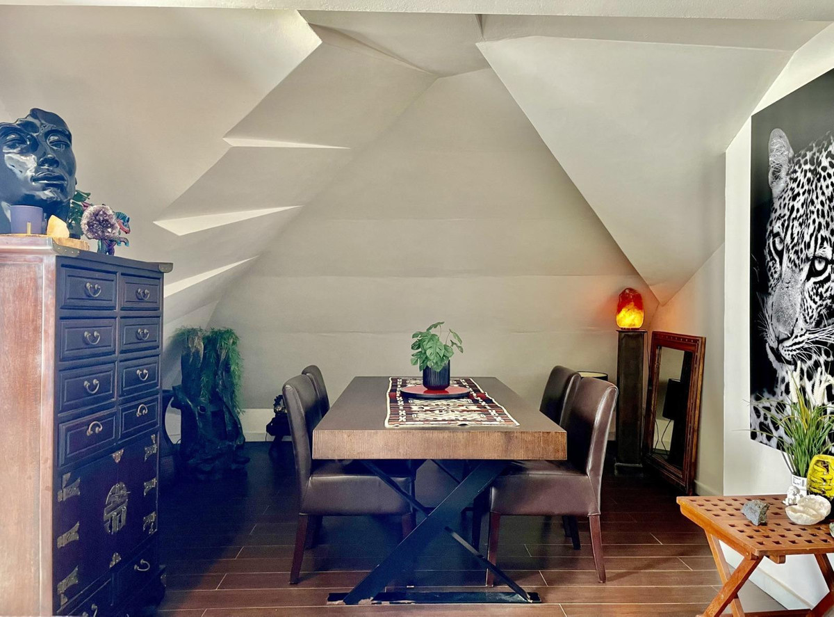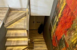El apartamento se accede a través de un hall de entrada privado, con escaleras que conducen a una planta principal luminosa y espaciosa. La sala de estar y comedor de planta abierta está diseñada en un estilo moderno de loft, con techos altos y grandes ventanas que inundan el espacio con luz natural. Una cocina totalmente equipada complementa la sala de estar, creando un flujo sin costuras para la vida cotidiana y entretenido.