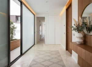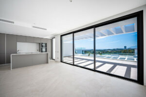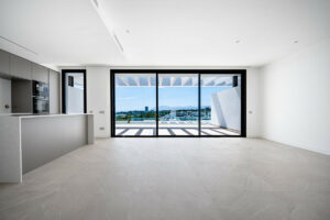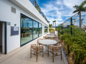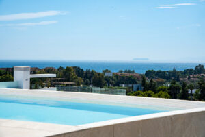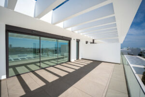 Ático Alma es un dúplex de nueva construcción situado en una exclusiva comunidad cerrada en Marbella Este. Cuenta con dos dormitorios con baño en suite, un aseo de cortesía y una amplia zona de estar de concepto abierto que integra la cocina, el comedor y el salón. Los grandes ventanales inundan la vivienda de luz natural y se abren a una amplia terraza con vistas al mar, las montañas y el campo de golf.