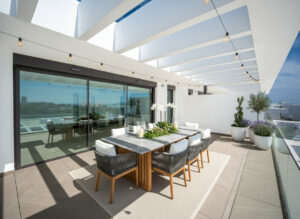 Cada detalle de este ático ha sido diseñado para ofrecer comodidad y estilo. Incluye suelo radiante, sistema de energía solar y un lavadero independiente. La terraza semi cubierta es ideal para disfrutar de cenas al aire libre o relajarse por la tarde mientras se contemplan los jardines y la costa.