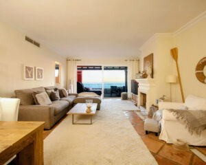 El salón tiene puertas correderas de cristal que se abren a una terraza descubierta, totalmente acristalada, con un toldo retráctil para dar sombra.