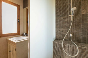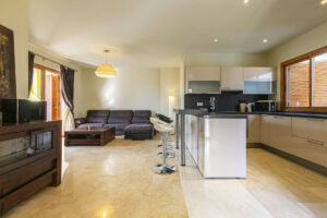 Dos dormitorios y dos baños en suite, con sala de estar y cocina abierta que tiene acceso a una terraza con vistas al jardín.
