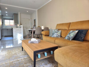 Nivel inferior: luminosa sala de estar, con acceso a la terraza inferior con hermosas vistas abiertas a las montañas y a la urbanización, nueva cocina abierta, 2 dormitorios y 2 baños, uno de ellos en suite, ambos tambien