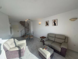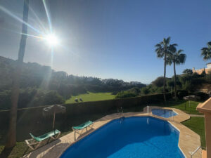 Precioso dúplex situado en la urbanización Las Flores del Golf, en Mijas Costa, que ofrece impresionantes vistas al golf, al mar y a las piscinas comunitarias. La propiedad se compone de 2 dormitorios y 2 baños, uno de ellos completamente reformado. La cocina, moderna y totalmente equipada, también ha sido renovada por completo. El luminoso salón dispone de acceso directo a una amplia terraza orientada al sur, ideal para disfrutar del sol durante todo el día y de vistas despejadas. En la planta superior, el segundo dormitorio cuenta igualmente con acceso directo a una segunda terraza espaciosa, que ofrece vistas aún más panorámicas al golf y al mar. La urbanización dispone de plazas de aparcamiento privadas dentro del recinto. Ubicada en un entorno tranquilo y rodeado de zonas verdes, la comunidad ofrece dos piscinas y jardines muy bien cuidados. El apartamento está rodeado de prestigiosos campos de golf como El Chaparral y Miraflores Golf. Las playas de Mijas Costa se encuentran a tan solo 2 km. En los alrededores, encontrará numerosos restaurantes, cafeterías, supermercados, farmacias y el centro comercial El Zoco, así como La Cala de Mijas, todo ello a pocos minutos en coche. Un ático luminoso, bien cuidado y perfectamente ubicado, ideal como residencia habitual, segunda vivienda o inversión para alquiler.