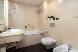 Baño: Con lavabo, inodoro, ducha y bañera.