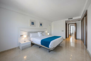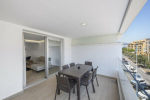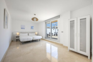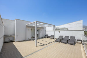 El ático duplex nos brinda un amplio salón con acceso directo a una de las terrazas con vistas abiertas y parciales al mar. La cocina integrada en el salón pero algo independiente al mismo tiempo está totalmente amueblada con electrodomesticos de lata gama. El dormitorio principal es en suite y con armarios empotrados, tambien en esta planta, un dormitorio de invitados con dos camas individuales y un baño exterior. En la planta de arriba se ha instalado un dormitorio con armario que tiene salida directa al gran solarium con vistas abiertas al boulevard y parciales al mar. La propiedad incluye dos plazas de parking.