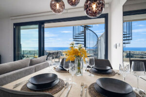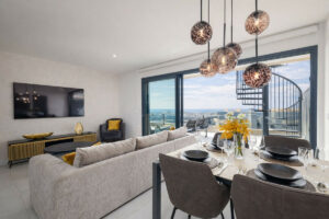 Uno de sus puntos fuertes es el espacioso solárium privado en la azotea, con jacuzzi e impresionantes vistas panorámicas de 360 grados al mar y a las montañas circundantes: el entorno perfecto para disfrutar del clima mediterráneo durante todo el año. El elegante salón se integra de forma natural con una segunda terraza amplia, creando una hermosa sensación de amplitud y confort.