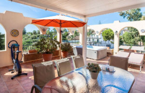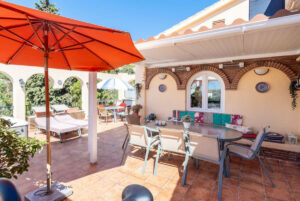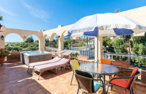 La terraza es el corazón de la vivienda: el lugar perfecto para disfrutar del estilo de vida mediterráneo, con un bonito jacuzzi desde el que contemplar el mar. Ideal para tomar el sol, cenar con amigos o relajarse en total privacidad.