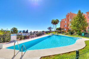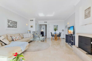 Desde el momento en que entra al recibidor, le impresionarán las fantásticas vistas al mar y la luz natural del apartamento. A la derecha se encuentra la cocina totalmente equipada con comedor y grandes ventanales con vistas al jardín comunitario y a una de las piscinas de la zona. A la izquierda del recibidor se encuentra el salón con chimenea y puertas acristaladas que dan a la terraza de 22 m² con sofá de obra y espacio para una mesa de comedor, barbacoa y plantas. ¿Y mencionamos que la terraza ofrece unas fantásticas vistas al mar y a Fuengirola?