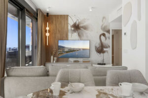 En el exterior, podrás disfrutar de la playa y las montañas, con una vista impresionante que crea el escenario perfecto para un café matutino relajado o una tranquila velada bajo las estrellas. A tan solo 250 metros de la playa, podrás dar agradables paseos costeros o simplemente disfrutar del aire marino.
