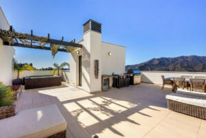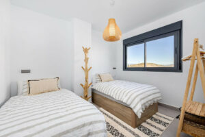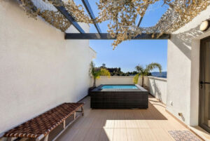 El acceso al solárium en la planta superior se realiza mediante una amplia y moderna escalera, que conduce a una terraza privada de gran tamaño. Esta impresionante terraza en la última planta ofrece amplio espacio para tomar el sol, instalar una barbacoa, así como zonas de comedor y descanso, además de la piscina plunge. La terraza disfruta de inigualables vistas panorámicas de 270 grados al campo de golf, las sierras y el parque natural de Barranco Blanco.