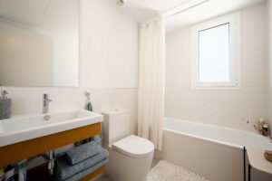 De vuelta en la planta baja, el lavadero está separado de la cocina por una puerta, donde hay espacio para almacenamiento (como una despensa), y encontramos una lavadora. Todos los electrodomésticos son de primeras marcas (Siemens). El apartamento cuenta con un sistema aerotérmico de alta eficiencia con bomba de calor. Hay aire acondicionado/calefacción central en toda la vivienda, con termostatos independientes en el salón y los dormitorios, y suelo radiante de bajo consumo en el dormitorio principal y el baño en suite.