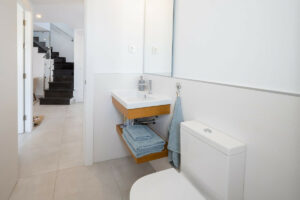 De vuelta en la planta baja, el lavadero está separado de la cocina por una puerta, donde hay espacio para almacenamiento (como una despensa), y encontramos una lavadora. Todos los electrodomésticos son de primeras marcas (Siemens). El apartamento cuenta con un sistema aerotérmico de alta eficiencia con bomba de calor. Hay aire acondicionado/calefacción central en toda la vivienda, con termostatos independientes en el salón y los dormitorios, y suelo radiante de bajo consumo en el dormitorio principal y el baño en suite.