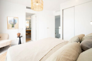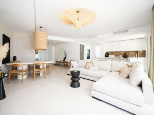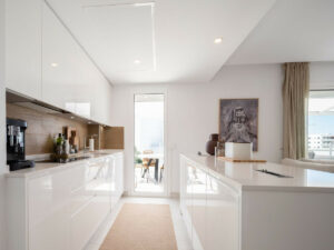 En la primera planta encontramos una zona de estar diáfana, luminosa y espaciosa, con techos altos que dan a este apartamento una sensación de amplitud nada más entrar. Este dúplex cuenta con preciosos suelos de Porcelanosa en todas las estancias y una cocina bien equipada con una preciosa encimera de Silestone, perfecta para recibir invitados o disfrutar de un relajante brunch. Todas las luces del techo de la casa son de bajo consumo y cuentan con elementos invisibles.