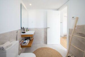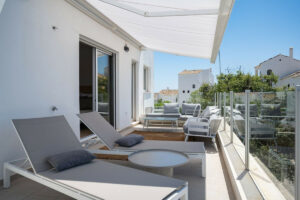Una sofisticada escalera moderna nos lleva al piso superior, donde encontramos dos dormitorios más, cada uno con su propio cuarto de baño. El dormitorio principal cuenta con amplios armarios empotrados. En ese mismo nivel, vemos una segunda terraza abierta, ideal para tomar el sol, ya que es perfectamente privada, y donde se puede disfrutar de un aperitivo mientras se contemplan las increíbles vistas.