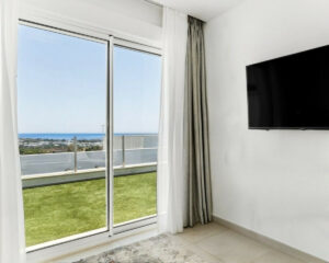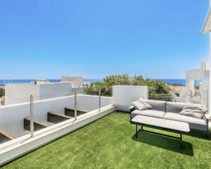 Una sofisticada escalera moderna nos lleva a la planta superior, donde se encuentra el dormitorio principal con su impresionante baño en suite, un espacio lujoso e invitador con abundante luz natural. También hay un segundo dormitorio de invitados igualmente luminoso y un baño adicional. Todas las habitaciones disponen de amplios armarios empotrados. En esta misma planta, encontramos una segunda terraza, perfecta para tomar el sol, ya que es completamente privada, y donde se puede disfrutar de un tentempié mientras se contemplan las maravillosas vistas.