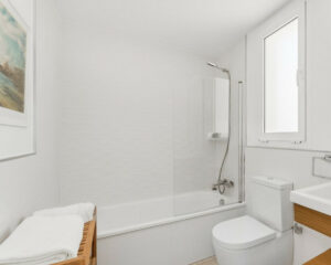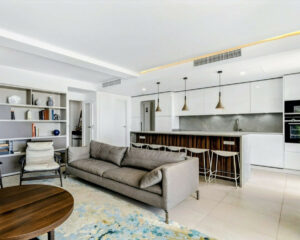 En la planta principal, encontramos un salón-comedor de concepto abierto, luminoso y amplio, con techos altos que confieren a este ático una sensación de amplitud al entrar. Este penthouse cuenta con un hermoso suelo de Porcelanosa en toda la vivienda, y una cocina completamente equipada que incluye una preciosa isla con encimera recientemente reformada, perfecta para recibir invitados o disfrutar de un brunch relajado. Todas las luces de techo de la casa son de bajo consumo y con elementos invisibles.