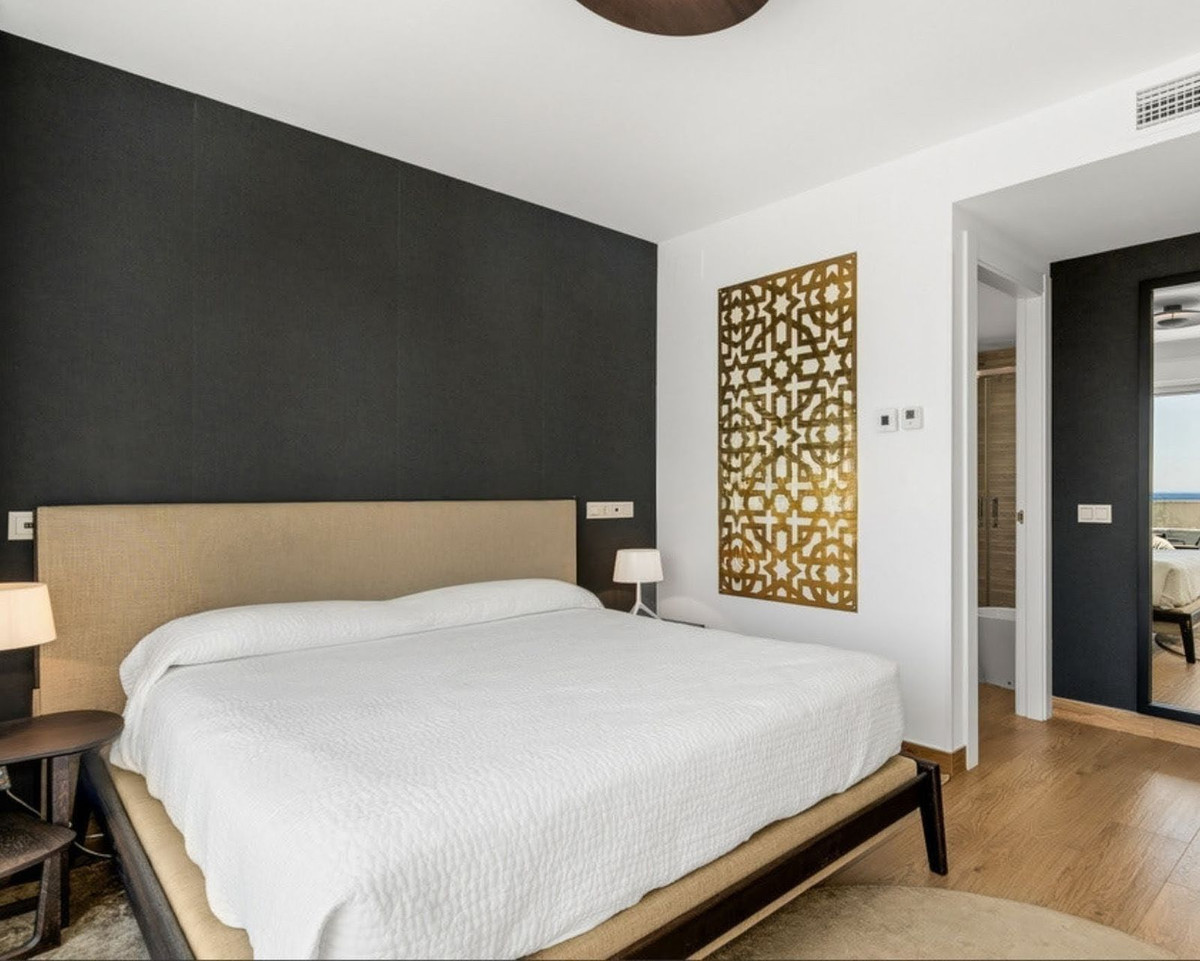 Una sofisticada escalera moderna nos lleva a la planta superior, donde se encuentra el dormitorio principal con su impresionante baño en suite, un espacio lujoso e invitador con abundante luz natural. También hay un segundo dormitorio de invitados igualmente luminoso y un baño adicional. Todas las habitaciones disponen de amplios armarios empotrados. En esta misma planta, encontramos una segunda terraza, perfecta para tomar el sol, ya que es completamente privada, y donde se puede disfrutar de un tentempié mientras se contemplan las maravillosas vistas.
