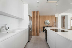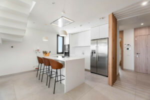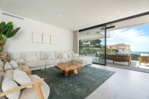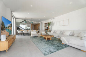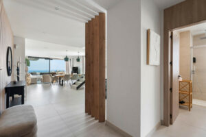 La planta principal se abre a un amplio salón-comedor con acceso directo a una gran terraza que enmarca la vivienda con vistas al Mediterráneo. Los ventanales de suelo a techo crean una transición fluida entre las zonas interiores y exteriores. La cocina moderna, con un diseño funcional y equilibrado, se sitúa como el corazón de la residencia.