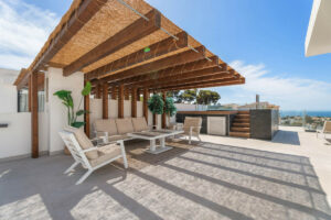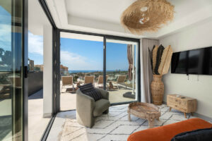 La planta superior introduce una sala de estar adicional que se abre al solárium —un refugio elevado con piscina privada y amplias terrazas con vistas panorámicas al mar Mediterráneo. Este espacio es ideal para el relax, las comidas al aire libre o el entretenimiento.