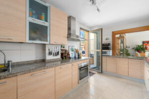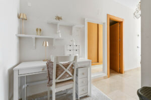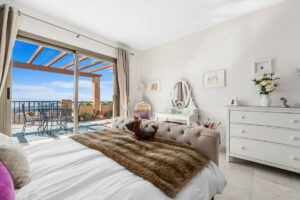 El amplio dormitorio principal cuenta con armarios empotrados, baño en suite y acceso directo a una terraza orientada al oeste. Hay dos dormitorios dobles adicionales, ambos con armarios empotrados, que comparten un segundo baño.