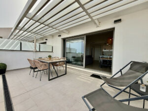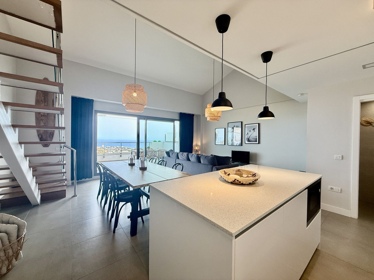 En planta baja nos encontramos el salón comedor con salida a terraza de planta baja con vistas panorámicas al mar, con la cocina en isla equipada con electrodomésticos de última generación, aseo para invitados.