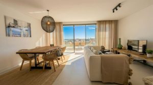 La zona principal de estar está bañada por luz natural y se integra de forma fluida con las terrazas exteriores, creando una conexión armoniosa entre el interior y el exterior.