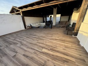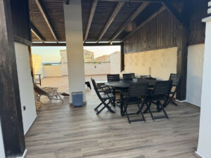 Dentro de un recinto cerrado que cuenta con piscina y jardín comunitario, la orientación sur de este ático garantiza luz natural durante todo el día. En la planta de arriba se sitúa una amplia terraza de 80m2 perfecta para reuniones con una gran pérgola de madera que cubre la mitad de la superficie para disfrutar de tanto sol como sombra.