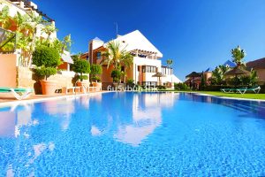 La urbanización ofrece dos piscinas comunitarias y extensos jardines perfectamente cuidados.
