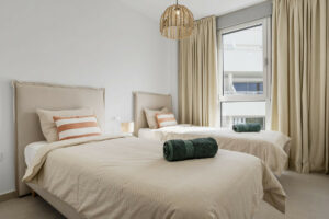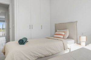 Tercer dormitorio: Ideal para invitados o niños, con baño en suite y amplio espacio de almacenamiento. Desde la terraza de la azotea, los residentes pueden disfrutar de un entorno tranquilo, perfecto para reuniones nocturnas o tomar una copa al atardecer mientras se deleitan con el ambiente mediterráneo.