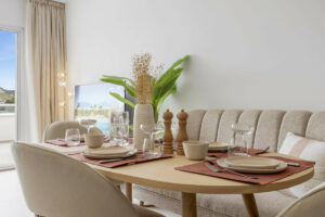 El luminoso salón de planta abierta cuenta con un cómodo sofá y sillones que se integran a la perfección con una espaciosa terraza orientada al sur, con vistas a los jardines bien cuidados y vistas parciales al mar, un espacio ideal para relajarse, cenar o disfrutar del sol.