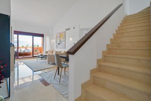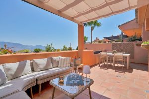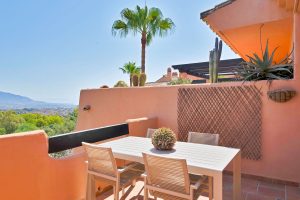 Este ático dúplex goza de una de las mejores ubicaciones dentro de un complejo residencial grande y popular. Construida sobre las onduladas laderas de la zona alta de Elviria, la comunidad utiliza auténtica arquitectura andaluza para crear un hermoso entorno con hermosos senderos pavimentados, fuentes de estilo morisco e impresionantes jardines mediterráneos. La comunidad es ideal para quienes deseen disfrutar de paseos por el paisaje natural de la costa, con increíbles vistas del valle de La Cala de Mijas, el mar y las impresionantes montañas que se extienden por la costa hasta Sierra Nevada. En invierno, la nieve en las cimas de la famosa estación de esquí se puede ver desde la propiedad.