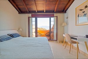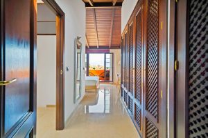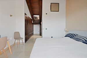 Al atravesar el salón-comedor de planta abierta, el techo de doble altura permite acceder a una atractiva escalera que conduce a la planta superior, donde se encuentra un magnífico dormitorio principal con techo inclinado de madera, un amplio vestidor y un precioso baño de alta gama con ducha a ras de suelo y lavabos dobles, además de una separación entre el baño principal y el aseo. Los techos inclinados de esta planta cuentan con claraboyas que inundan las habitaciones de luz natural y aportan aire fresco. El dormitorio principal goza de privacidad y cuenta con una magnífica terraza orientada al este con impresionantes vistas a la sierra de Mijas. Ideal para contemplar el amanecer.