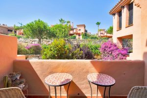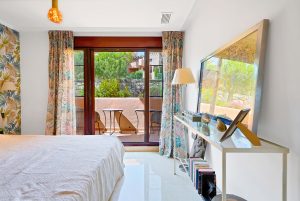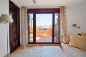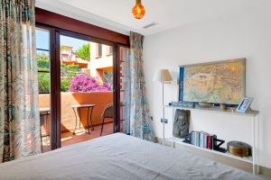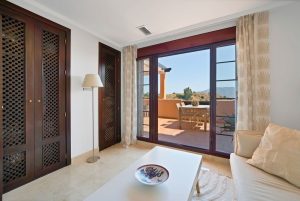 Volviendo al interior, se encuentra el tercer dormitorio, que obviamente se beneficia de su propio acceso a la terraza, con un sofá cama extraíble y armarios empotrados. Entre este y el segundo dormitorio se encuentra el segundo baño, también con ducha a ras de suelo y lavabo doble. El segundo dormitorio se encuentra al otro lado del apartamento La Mairena, también con armarios empotrados y acceso a su terraza, ahora orientada al oeste. Esta zona actualmente es lo suficientemente amplia como para colocar tumbonas y una mesa; sin embargo, cabe destacar que la comunidad permite ampliar esta terraza unos 6 metros cuadrados, por lo que se podría crear fácilmente una amplia zona privada de tumbonas, con un coste estimado de unos 8.000 euros.