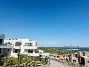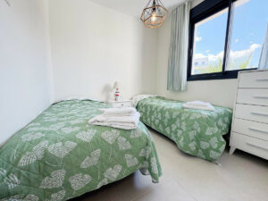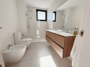 El espacioso interior cuenta con un luminoso salón-comedor de planta abierta, una moderna cocina totalmente equipada y acceso directo a una gran terraza privada, ideal para disfrutar de la tranquilidad del entorno y las impresionantes vistas. El dormitorio principal incluye baño en suite con ducha a ras de suelo. Dos amplios dormitorios adicionales con armarios empotrados, un elegante baño con lavabos dobles y ducha a ras de suelo, y una zona de lavandería completan la distribución.