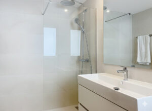 El alojamiento consta de tres dormitorios bien proporcionados, cada uno con armarios empotrados y persianas eléctricas para mayor privacidad y confort. La suite principal cuenta con baño en suite y, junto con otro dormitorio, tiene acceso directo a la segunda terraza de esta planta. Ambos baños están acabados con un excelente nivel, con accesorios y grifería de alta calidad. Una moderna escalera con barandilla de cristal conecta el salón con un solárium de 90 m² que ofrece vistas panorámicas abiertas al mar, preinstalación para jacuzzi y amplio espacio para recibir invitados o simplemente relajarse y disfrutar del ambiente mediterráneo.