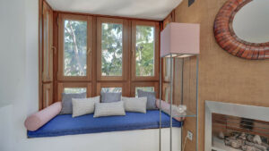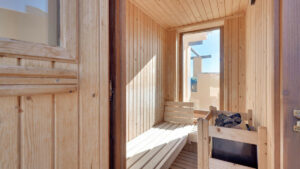El dormitorio principal, situado en la planta superior, da acceso directo a una gran terraza con sauna privada, zona de barbacoa y bonitas vistas al mar: un lugar para relajarse y disfrutar.