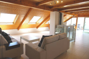Actualmente, el acceso a la planta superior se realiza mediante ascensor privado, aunque puede volver a instalarse la escalera de caracol original si se prefiere, aportando encanto y carácter.