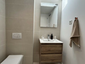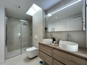 Cuenta con domótica y sensores para detección de humo, así como mecanismos Jung. La cocina, equipada con mobiliario alto y bajo, encimera tipo Silestone y electrodomésticos panelados con eficiencia energética A, incluye placa, horno, microondas, campana, frigorífico, lavavajillas y lavadora-secadora. Los baños presentan sanitarios suspendidos, platos de ducha extraplanos con mampara y, en el principal, doble lavabo con mueble integrado.