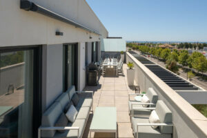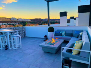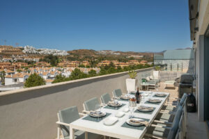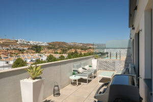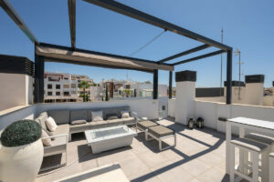 Uno de los grandes atractivos de la propiedad es su espectacular terraza de 122m², ideal para disfrutar del clima mediterráneo y organizar reuniones al aire libre. Este amplio espacio exterior se convierte en una extensión natural del salón, proporcionando vistas despejadas y un entorno perfecto para el relax.