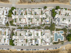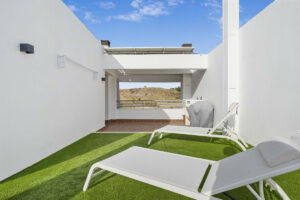 La planta superior alberga un amplio solárium, igualmente orientado al oeste, ideal para tomar el sol, recibir invitados o contemplar las puestas de sol. Esta planta cuenta además con un sistema de placas solares que genera suficiente electricidad no solo para cubrir todo el consumo, sino también para vender el excedente a la red, lo que supone facturas de electricidad de 0 € al mes.