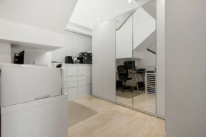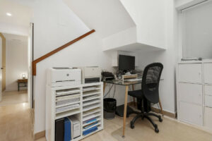 En la planta inferior se ubican tres dormitorios más grandes de lo habitual, todos con suelos nuevos. Dos de ellos cuentan con baño en suite, ambos modernizados, y el tercero dispone de un baño independiente, también renovado. Incluso hay espacio en esta planta para una zona utilizada como oficina.