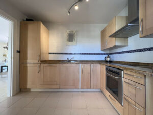 En el interior, el apartamento cuenta con tres dormitorios y dos baños. El dormitorio principal dispone de baño en suite para mayor comodidad y privacidad. La cocina está completamente equipada y comunica con un lavadero independiente.