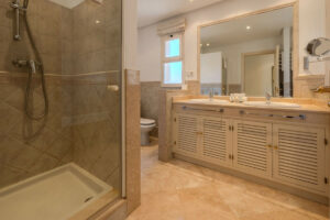 El dormitorio principal es espacioso y elegante, con acceso directo a la terraza, un amplio vestidor y un lujoso baño en suite con ducha a ras de suelo y bañera con ducha adicional. Los otros dos dormitorios son de buen tamaño, con armarios empotrados, y comparten un baño contiguo equipado con una amplia ducha a ras de suelo.