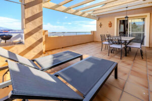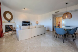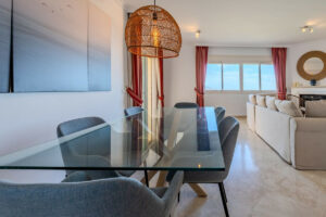 Este ático, situado en la última planta, es accesible a través de un elegante vestíbulo que conduce a un amplio salón de planta cuadrada. Este amplio espacio incluye comedor y sala de estar, con una encantadora chimenea. El acceso directo a la generosa terraza amplía la zona de estar, ofreciendo el espacio perfecto para relajarse y comer al aire libre, disfrutando de las cautivadoras vistas a la costa.