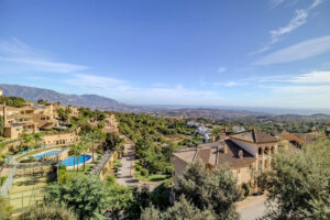 La urbanización cerrada El Vicario III ofrece magníficas vistas del paisaje circundante y del mar Mediterráneo, extendiéndose hasta la costa de Fuengirola. Estas vistas panorámicas se pueden disfrutar desde todas las estancias principales de la propiedad, incluida la espaciosa terraza orientada al este. La urbanización cuenta con jardines impecablemente cuidados, una piscina comunitaria y pistas de pádel para el disfrute de los residentes.