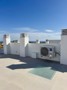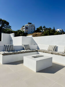 La cocina personalizada cuenta con una isla contorneada y electrodomésticos Bertazzoni de primera línea. Las paredes de baño y zonas al aire libre están cubiertas con azulejos de porcelana beige 60×60, que se utilizan a lo largo del diseño para proporcionar coherencia. Las elegantes características negras y las claraboyas de los dos baños les dan el toque moderno ideal, y usted realmente puede vivir cómodamente en el sol aquí.