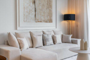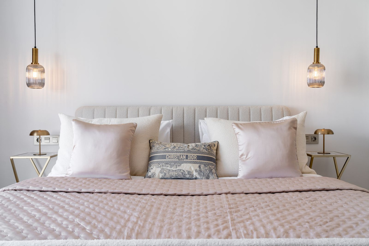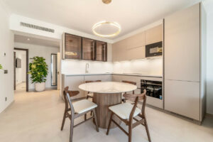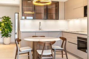 En el interior, la vivienda ha sido completamente transformada con un diseño de interiores a medida y mobiliario integral, combinando sofisticación contemporánea con una sensación de calidez. Obras de arte por encargo y cortinas hechas a mano aportan personalidad y distinción, mientras que la nueva carpintería a medida proporciona almacenamiento discreto y funcional. El salón principal se centra en una pared de televisión retroiluminada con sonido envolvente integrado, un punto focal impresionante que equilibra el diseño moderno con la comodidad diaria.