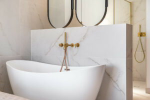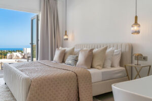 La suite principal ha sido concebida como un santuario, con una bañera exenta estratégicamente situada para disfrutar de vistas panorámicas tanto del mar como del paisaje. Cada baño está terminado con lujosos azulejos italianos, que subrayan la estética refinada de la propiedad.
