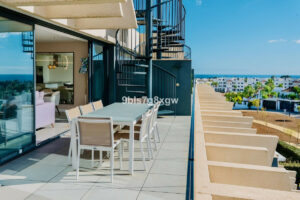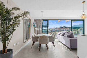 El apartamento destaca por su luminosidad y distribución fluida. Grandes ventanales del suelo al techo crean una perfecta continuidad entre el interior y el exterior. La cocina, totalmente equipada (con lavadero independiente), se abre a un amplio salón-comedor que da acceso a una gran terraza privada de 31m², orientada al suroeste y parcialmente cubierta: un lugar ideal para comer al aire libre, disfrutar de un momento de lectura o simplemente admirar las vistas panorámicas al mar, Gibraltar y al zoológico de Selwo. Al caer la noche, tras contemplar la puesta de sol, la vista se vuelve sencillamente mágica.